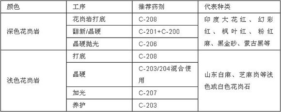 1.1花崗巖的晶硬處理一般是根據(jù)花崗巖的顏色而選擇不同藥劑和工藝,如下表