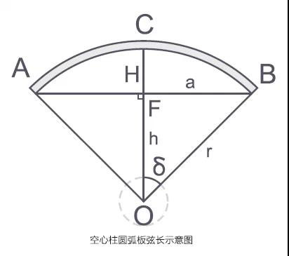 為方便表達,設∠BOC=∠δ,設半弦長FB為a,弦的圓心距OF為h、半徑為r,即在 Rt△OFB中: