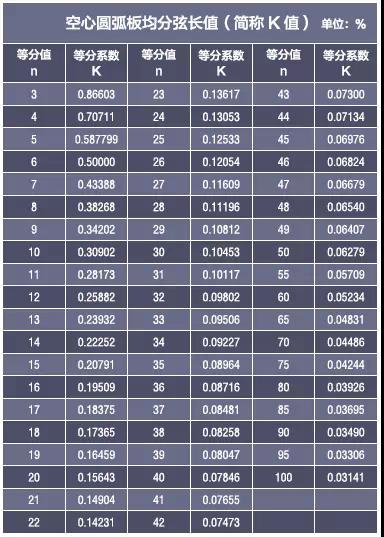 下面“圓均分弦長系數”K值表或許能夠給你帶來方便(如下圖):