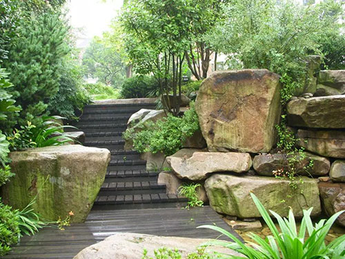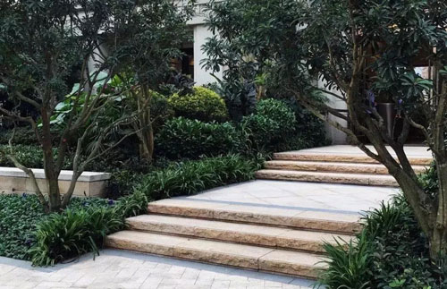 利用景石或者灌木收邊的形式將臺(tái)階做一個(gè)收頭處理。景石擺放時(shí)注意與臺(tái)階要有咬合,