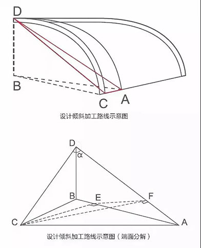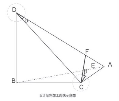 圖中 DB、BC 為弦長;CD 為弧板弦長,AD為斜切后弦長,CA為弧板順高度切除的最大尺寸。可見:∠CDA 就是以弧板底面定位時的工作臺轉角α,∠FCE為扳刀角 β: