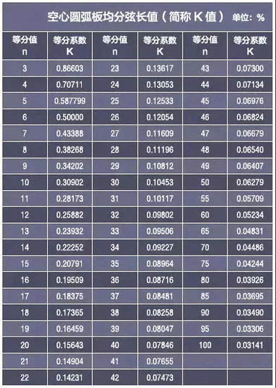 下面“圓均分弦長系數”K值表或許能夠給你帶來方便(如下圖):