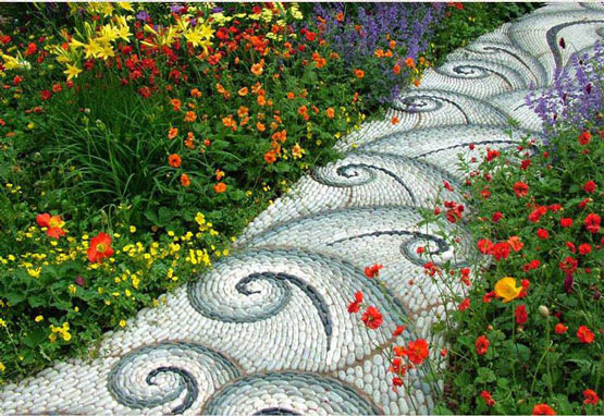 這個工序比較關鍵,大家可以按照自己喜歡的圖形紋路安裝鵝卵石,安裝時注意一定必須將鵝卵石的3分之2左右厚度插入水泥干灰中,鵝卵石與鵝卵石之間的距離密實,也要注意控制石頭表面保持在一個水平面上。