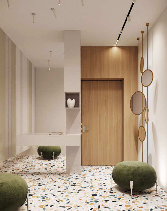 工廠預制型水磨石是通過在工廠經過現代化設備加工而成,一般經過布料、震動、高壓、養護、切割等工序,可控性較高,成品為單片板材,運輸方便,施工成熟,施工方式與瓷磚、大理石相似,適合各種環境的應用。