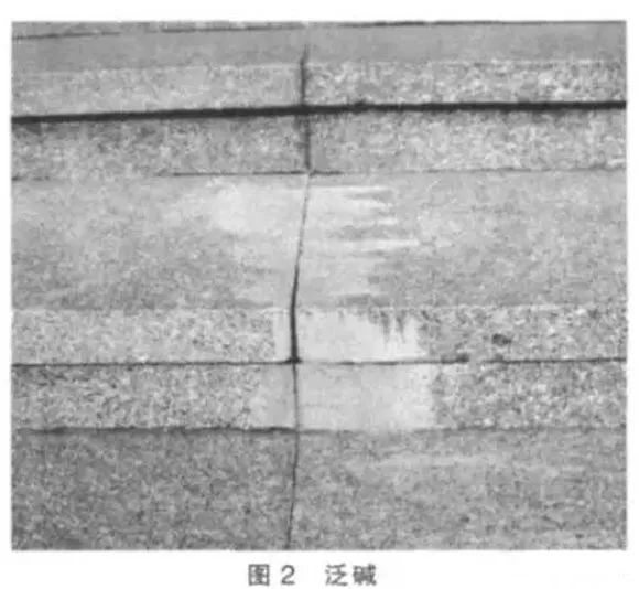 由于桐廬青花崗巖厚度大、致密、吸水率低,水份蒸發(fā)時堿Ca(OH)2等物質(zhì)從