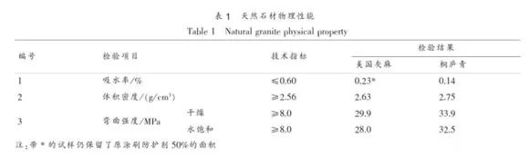 石材http://www.stonebuy.com/的部份物理力學(xué)性能見表1。從檢驗結(jié)果來看,美國灰麻、桐廬青二種花崗巖的三項性能均達到GB/T18601-2001《天然花崗巖建筑板材》的技術(shù)指標要求。但桐廬青花崗巖的性能明顯優(yōu)于美國灰麻花崗巖,它強度高、密實、吸水率低。