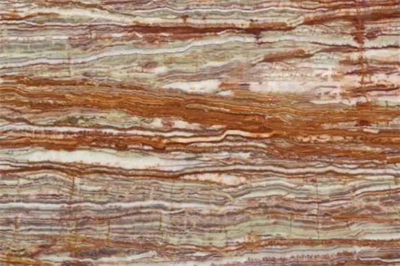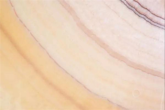 特征:底色為淺黃色,白色、紅色條紋相間,淺色帶中有羽狀晶體。裂紋少、無孔洞,黃底石質較為細膩,白底石質較為粗疏,通透性好。
