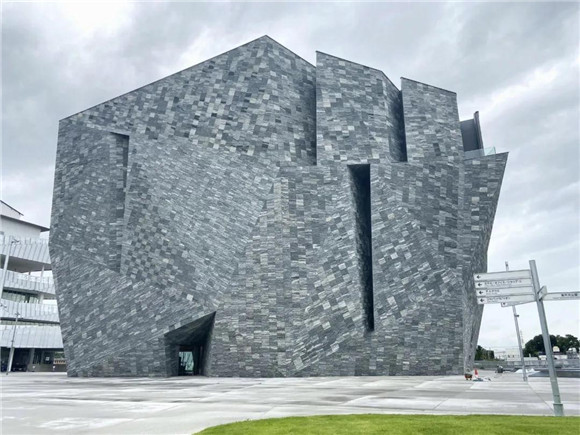 (角川武藏野博物館是由20000多塊50至70公斤重的花崗巖組成的超多邊形建筑,石塊微妙變化的顏色、復雜且凹凸不平的外壁為建筑帶來千變萬化的外貌。隨著太陽照射角度的變化,建筑時而像恐龍般肌膚粗糙,時而如魚鱗般閃耀動人,十分富有動態的美感)
