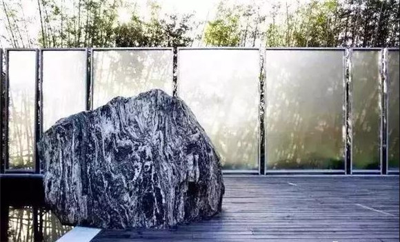 石上則有著明快的白色花紋,形似溪水瀑泉、浪涌雪沫,亦如幅若隱若現的山水畫卷