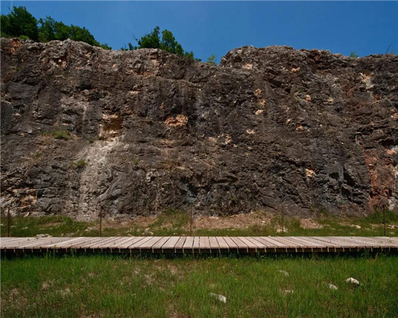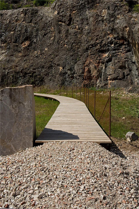 教育步道采用當(dāng)?shù)氐拇袒蹦竞突炷涟褰ㄔ於桑刂墒瘓龅谋砻娌贾茫瑥亩由炝藱M穿沼澤的人行道。這條路線以鋼筋混凝土墻為特征,增加一系列由鋼筋支撐的欄桿來提高安全性能。建成后的步道,引導(dǎo)著人們一路走向大理石采石場上方的廢棄洞穴,向人們展示一系列各不相同的采石技術(shù)和各種類型的被開采出來的石料。
