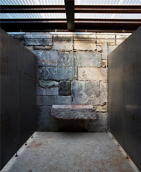 此外,設(shè)計(jì)團(tuán)隊(duì)還在教育步道的起點(diǎn)處設(shè)計(jì)了一座帶有公共便利設(shè)施的新建筑。這座建筑完全由大理石砌塊建造而成,上方由HEB鋼梁支撐的半透明頂棚帶給了空間自然光亮的照明方式,而頂棚和墻體之間的開放帶則實(shí)現(xiàn)了整體建筑的自然通風(fēng)。建筑的墻體由具有不同表面紋理和顏色的大理石塊建造而成,室內(nèi)的洗手盆采用了一種古老的、純手工開采的大理石打造,由氧化金屬格柵制成的門體契合了
