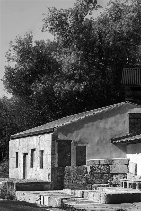 采石場加工工廠空間的重建,設(shè)計(jì)團(tuán)隊(duì)通過重新利用和升級(jí)設(shè)有原始生產(chǎn)設(shè)施的老舊建筑來完成。整個(gè)工程具體包括兩個(gè)分散的建筑體量:一個(gè)可以看作是大理石棚屋的主建筑體量和一個(gè)用于組織入口和交通流線的輔助體量。