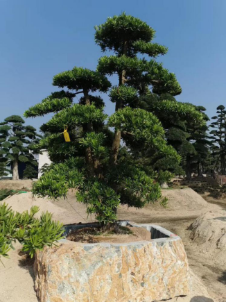 圖2高聳的羅漢松挺拔青翠,茂密秀美,配以質樸的古拙的花盆,更加突顯了羅漢松的挺拔秀美。藍天下這款盆景更顯得珍貴,高檔。
