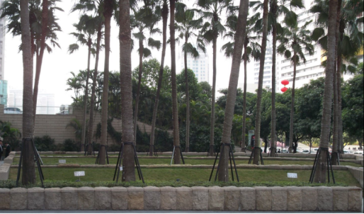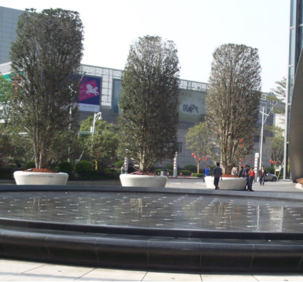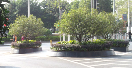 圖18為深圳證券交易所附近的水景花池,圓弧形的花池里種植著高大的喬木,與遠處的噴泉構成了一道靚麗的城市風景線。