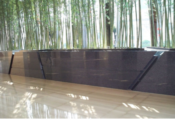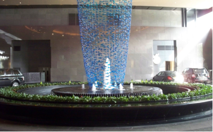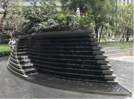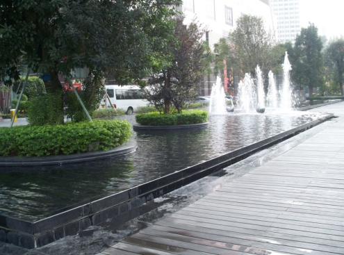 圖12為深圳京基100大廈瑞吉酒店入口處的黑金砂打造的噴水池。池內種植綠色植物,與水景、石景、燈光交相輝映,創造了非常美好的環境空間。