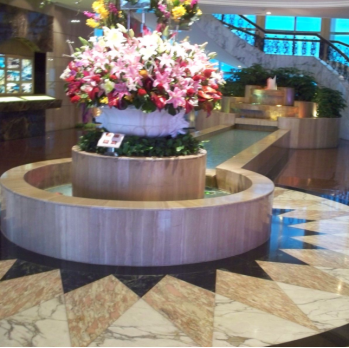 圖17為陽光酒店大堂內的花池照片,用意大利木紋做成的圓弧形花槽里放置著鮮花,在綠葉的陪襯下綻放著美麗的花朵。