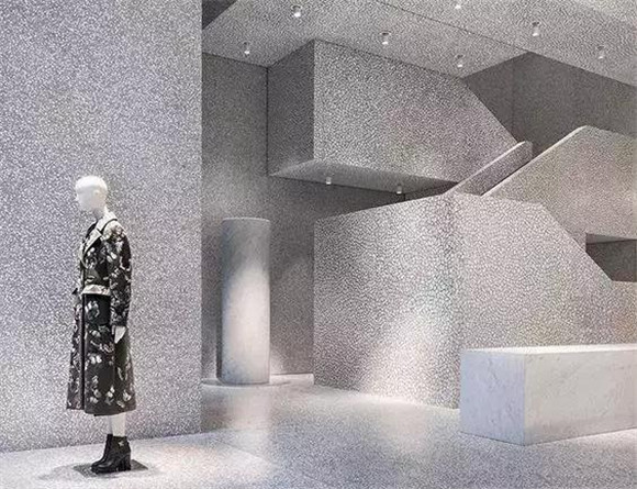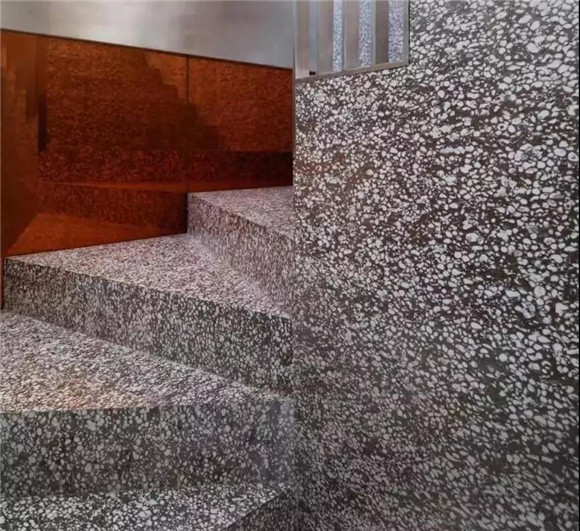 水磨石在墻面,家居及臺面等部分的應用上,主要運用的是預制板材干掛、粘貼(膠粘+濕貼)的工藝,我們可以感受一下實際應用的案例:
