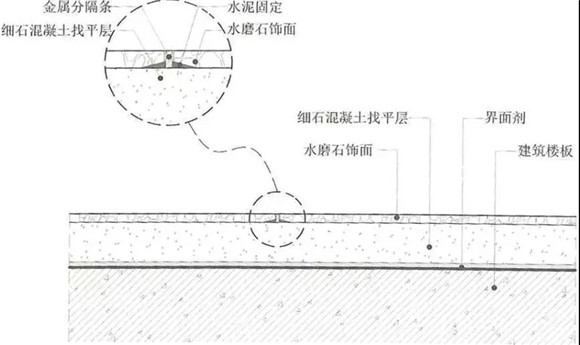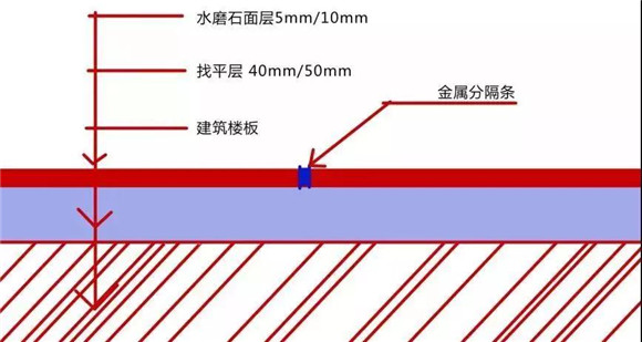 (1)水磨石現場澆筑=找平層+金屬分隔條+水磨石面層