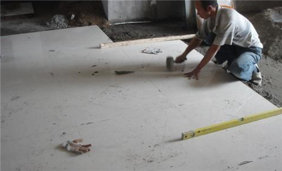 一般房間應先里后外進行鋪設,即先從遠離門口的一邊開始,按照試拼編號,依次鋪砌,逐步退至門口。 在鋪好的干硬性水泥砂漿上先試鋪合適后,翻開石板,在水泥砂漿上澆一層水灰比 0.5的素水泥漿,然后正式鑲鋪。安放時四角同時往下落,用橡皮錘或木錘輕擊木墊板(不得用木錘直接敲擊大理石板),根據水平線用水平尺找平,鋪完第一塊向兩側和后退方向順序鑲鋪,