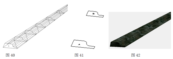 圖40是用圖41中的大小不同的兩個截面圖形A與B經(jīng)過放樣命令形成的線框圖;圖42是貼材質(zhì)后的效果圖。