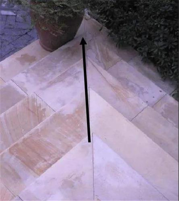2)、忌用一步臺階,至少兩步,高度一般為150mm,需考慮臺階整體有規律對縫或錯縫拼接。