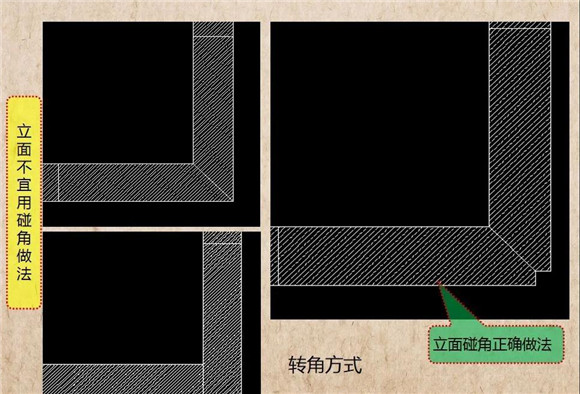 ① 、45 °角拼接:一些異形線腳,為保證美觀,常用45 °角拼接,但切角容易損壞。