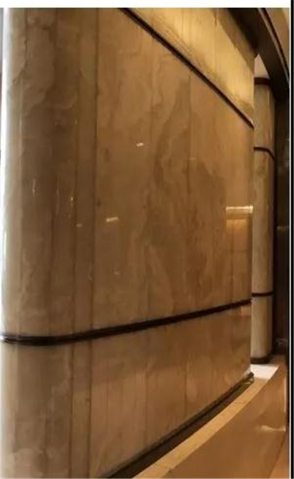 圖2為拍攝于深圳星河麗斯卡爾頓酒店里的照片,位于大堂正中央的一個背景墻屏風。轉(zhuǎn)角圓弧板用50mm寬的小條粘接而成的;