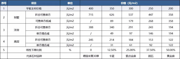 別墅約715元/m2;平層約388元/m2,高層約245元/m2.在此基礎上如主材材料進行更替,則平板價格每下降50元,各業態可售單方下降分別為:別墅約89元/m2;洋房約49元/m2,高層約31元/m2.