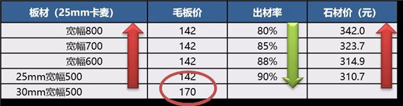 通常情況下幅寬越大,板材出材率越低,幅寬每上升100mm,則出材率降低3%~5%,板材亦成品同比增加3%~5%。