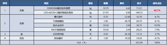 龍骨一般采用鋼型材Q235B,立柱一般采用鋼方管,槽鋼;橫梁,一般采用角鋼;型材的選擇決定龍骨的成本(占60.7%)