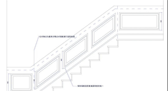 線條落地做法比較簡(jiǎn)單,一般就是腰線垂直向下落地收口,需要注意的是在落時(shí)也要考慮欄桿的位置是否有影響等,比如高度是否合適。比較簡(jiǎn)單,這里就不做描述了。