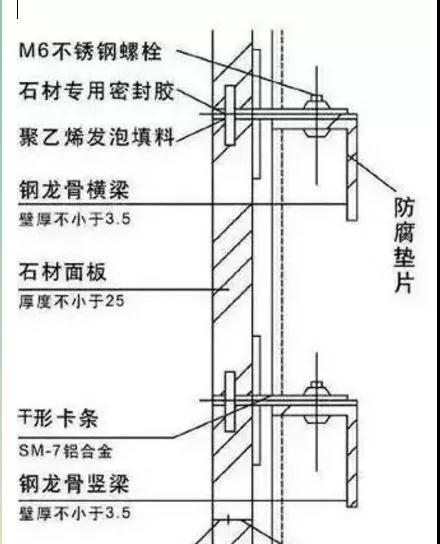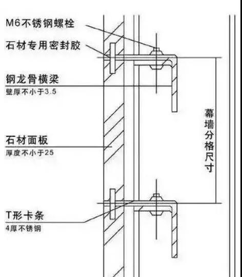 通槽式掛法一般采用鋁合金SE組合掛件(部分采用T型或蝶形掛件),在每塊石板上下邊開通長槽,槽深度小于15mm,開槽寬度宜為6mm,掛件厚度大于4mm。