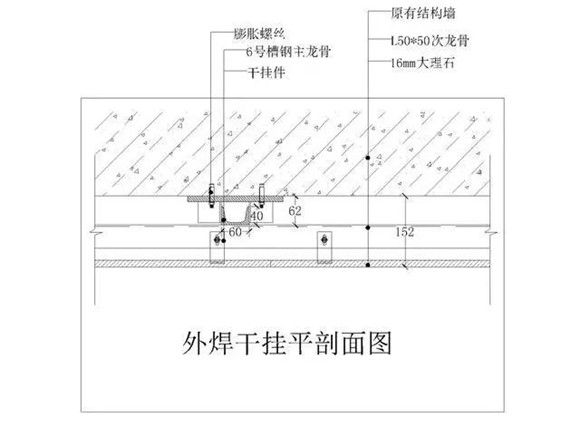 ◆輔材:a.不銹鋼膨脹螺絲,b.不銹鋼干掛飄件,c.云石膠,d.干掛AB膠,6#槽鋼主龍骨及∠50角鋼次龍骨;