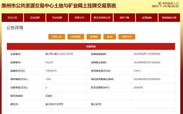 此外,競得人還需要提供不低于30億元的資金,用于礦區所在片區稔平半島內的交通基礎設施項目建設,助推城鄉融合發展。并且在簽訂《采礦權出讓合同》之日起12個月內須建場投產,除不可抗力或政策因素影響外,逾期不建場,由出讓人依法依規無償收回已出讓的采礦權。