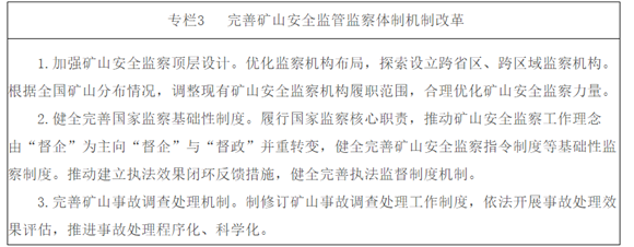 企業(yè)http://www.stonebuy.com/enterprise/負(fù)責(zé)”的礦山安全監(jiān)管監(jiān)察體制,進(jìn)一步厘清各層級(jí)安全職責(zé)邊界,強(qiáng)化層級(jí)治理,明確每一處礦山日常監(jiān)管主體,實(shí)現(xiàn)風(fēng)險(xiǎn)分級(jí)管控。礦山安全監(jiān)察機(jī)構(gòu)依法履行國(guó)家監(jiān)察職責(zé),加強(qiáng)對(duì)地方政府落實(shí)礦山安全屬地監(jiān)管責(zé)任的監(jiān)督檢查,著力防范化解區(qū)域性、系統(tǒng)性礦山安全風(fēng)險(xiǎn),將礦山安全監(jiān)察機(jī)構(gòu)對(duì)地方政府的監(jiān)督檢查納入到政府年終考核。地方各級(jí)礦山安全監(jiān)管部門落實(shí)屬地監(jiān)管責(zé)任,消除監(jiān)管盲區(qū),強(qiáng)化監(jiān)管措施。
