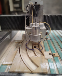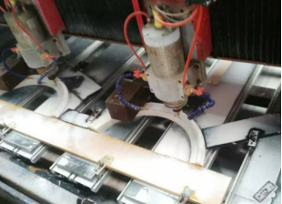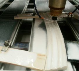 雕刻機多用于加工旋轉樓梯的平彎線條,象旋轉樓梯的扶手線條。加工立彎線條的話,立彎位線條的拱高不能太大了。圖1為雕刻機雙刀雕刻彎位線條。
