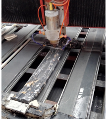 按圓弧板的加工工藝用電腦金剛石串珠繩鋸或水刀機切割圓弧板,并按切割順序編號。立彎位線條在厚度方向加5mm的加工余量;平彎線條在高度方向依據合料的數量加余量。雕刻機具有切割功能。如果待加工的彎位線條厚度小于40mm,可以由雕刻機在加工彎位線條時直接切割下來,見圖2。