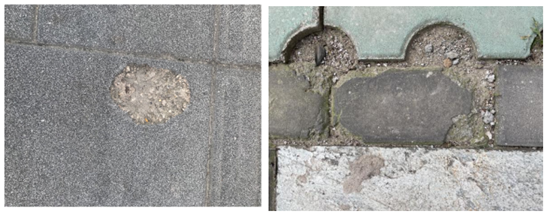 “PC”磚由面層+底層構成。面層就是裝飾層,底層是混凝土層或廢物層,或廢渣層,從圖1的側面可以看出。“PC”磚可以看成面層主料與底層混凝土或其它材料復合而成的,正是因為它是二次加工制成的,容易導致面層與底層的分離。當面層被外力破壞后,底層暴露出來后就變得無任何裝飾性了,而且可能成為一堆爛渣了。圖2是筆者拍攝于深圳一市政人道上的“PC”磚,表面的面層不知何故爛了,可以看出面層的厚度最多也就5mm厚,底面層已經露出來了,底面層有如爛豆腐渣。