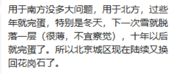 北京的朋友是國家建筑材料測試中心的專家,他指出:“PC”磚用于南方沒多大問題,用于北方,過幾年就完蛋。特別是冬天,下一次雪就脫落一層(很薄,不宜察覺),十年以后就完蛋了。所以北京城區現在陸續鏟除了“PC”磚,又換回花崗石了,重回花崗石的時代了,真是瞎折騰的。還是經過千錘百煉的花崗石是“真金不怕火煉”的。