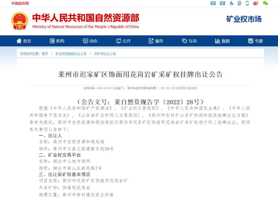 該礦區位置位于山東省萊州市柞村鎮遲家莊村南。礦區面積0.263平方千米。開采礦種屬于飾面用花崗巖,資源儲量:花崗巖礦資源量礦石量852.08×104m3,荒料量206.89×104m3。開采標高297.55米至135米,該礦區采礦權出讓10年,起拍價為4340萬元。申請報名的起止時間在2022年10月17日—2022年10月26日,掛牌時間在2022年10月17日—2022年10月28日。
