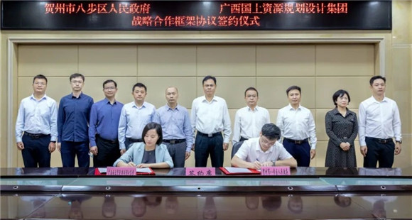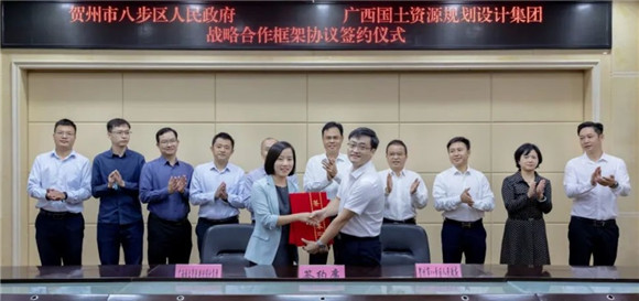 賀州市八步區(qū)委書記雷少華、廣西國土資源規(guī)劃設(shè)計集團(tuán)有限公司黨委書記/董事長鄧強(qiáng)、賀州市八步區(qū)委副書記葉梓共同見證簽約儀式,賀州市八步區(qū)委常委/副區(qū)長馬攀代表賀州市八步區(qū)與廣西國土資源規(guī)劃設(shè)計集團(tuán)有限公司簽訂戰(zhàn)略合作框架協(xié)議。