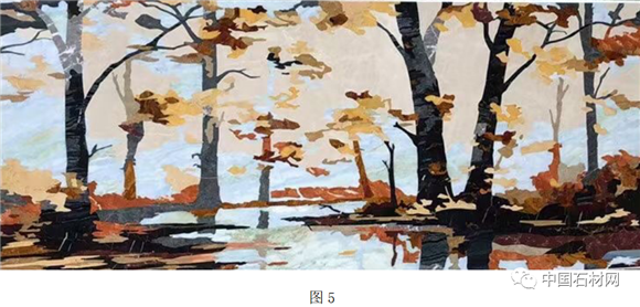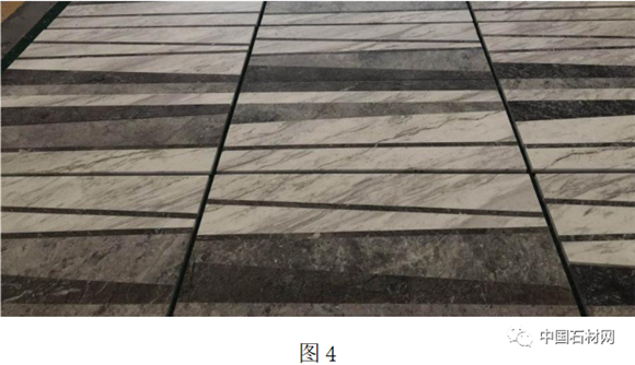 圖4拼花是由三種材料制造成的深圳某高檔住宅室內(nèi)裝飾的拼花。可以看出來有兩種灰色的材料顏色相差并不大,顏色之間沒有跳躍性。這種顏色相近的材料加工出來的拼花由于顏色太相近,加工出來的拼花整體效果不好,沒有什么裝飾性和欣賞性,更別談什么藝術(shù)效果了。