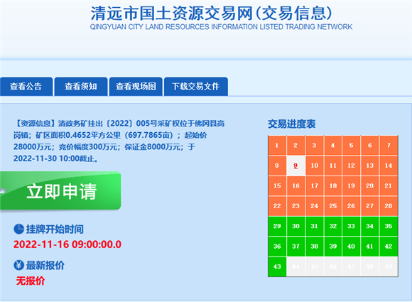 (六)競買申請人應當于2022年11月16日至2022年11月28日登陸清遠市自然資源交易系統提交競買申請并交納競買保證金。競買申請截止時間為2022年11月28日15時,競買保證金到賬截止時間為2022年11月28日16時,對按時足額交納競買保證金的競買申請人,網上交易系統將自動確認其競買資格。
