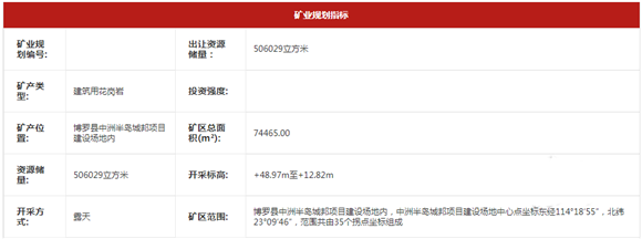 據該項目信息顯示,項目為惠州市銀泰達實業有限公司工程建設項目范圍內砂石等礦產資源。礦區范圍為博羅縣中洲半島城邦項目建設場地內,中洲半島城邦項目建設場地中心點坐標東經114°18′55″,北緯23°09′46″,范圍共由35個拐點坐標組成,礦區總面積74465平方米,資源儲量為506029立方米。