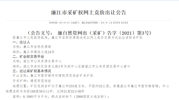11月9日,經(jīng)廉江市人民政府批準(zhǔn),廉江市自然資源局掛牌出讓了廉江市青平鎮(zhèn)墩陂建筑用花崗巖礦采礦權(quán)。該礦區(qū)位于廣東省湛江市廉江市青平鎮(zhèn),礦區(qū)面積0.0884平方千米,花崗巖資源量322.46萬立方米,出讓年限10年,起始價2266.15萬元。