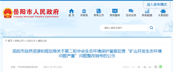 按照省委省政府《關于印發<湖南省貫徹落實第二輪中央生態環境保護督察報告整改方案>的通知》(湘發電〔2021〕63號)和省突出環境問題整改領導小組辦公室《關于做好突出生態環境問題整改銷號工作的通知》(湘突環改辦函〔2019〕16號)等文件要求,我市高度重視,印發了《岳陽市貫徹落實第二輪中央生態環境保護督察報告整改方案》(岳發電〔2022〕1號),進一步明確“礦山開發生態環境問題嚴重”問題整改責任、整改措施和整改時限,積極推進問題整改落實,目前已取得階段性成效,達到了銷號要求。