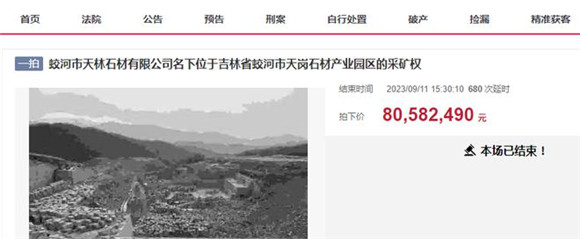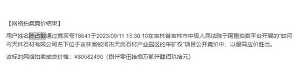 到了9月11日,從早上八點開始,又進入新一輪的激烈角逐,當價格加到了3900萬元后,享有優先購買權的人也是退出了競爭,十點常規拍賣時間已經過,但是拍賣還沒有結束的跡象,進入延時競拍后。雖然拍賣有5分鐘的延時,但很多時候,出價競拍的間隔時間卻不到一分鐘,甚至才間隔三四秒,又有人出價了。拍賣到最后,也是只剩兩個人在競拍了,拍賣一直延時到了下午三點半才結束,最終經過804次的加價后,這宗采礦權是以8058.249萬元成交,成交價比起拍價高出了7525.5萬元,溢價率高達1412.58%。這溢價率屬于超過級別的。