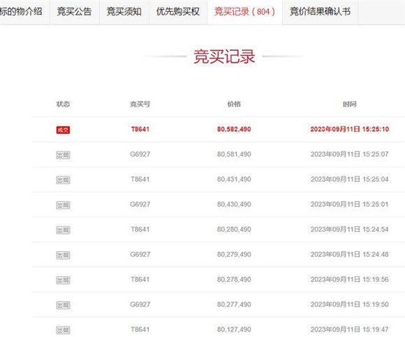 企業http://www.stonebuy.com/enterprise/)報名競拍,其中包括一個享有優先購買權的人報名。拍賣從9月10日十點開始進入加價時間,雖然拍賣到9月11日十點才到結束時間,但是拍賣開始進入瘋狂加價模式,拍賣每次的加價幅度最低為1000元,實際加價,很多人都是幾萬、幾十萬,甚至幾百萬的加價,9月10日,拍賣的價格就到了2900萬元了,遠比起拍價高了。