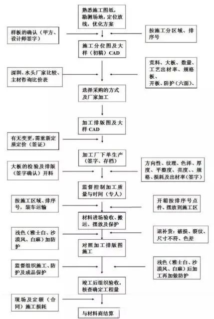 (4) B(加工排版圖):加工廠簽字確認---采購員---項目部(施工班 組長、施工監理、項目技術總監、項目經理)共同審核簽字確認(存檔)---報采購員簽字(存檔)---加工廠下單(存檔)