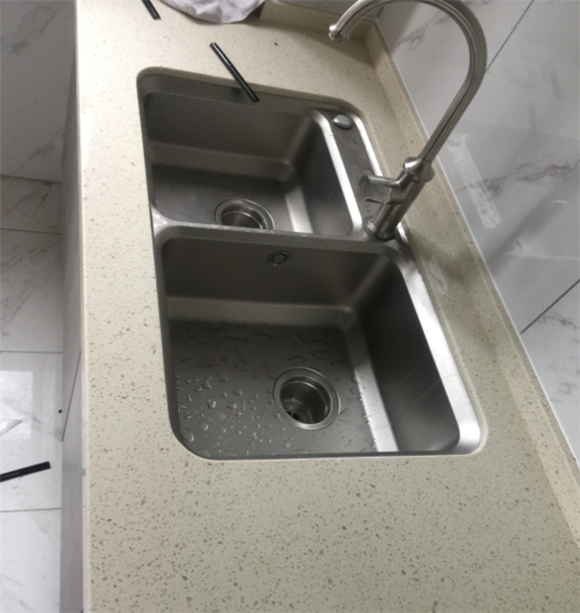 第二種,水槽和臺(tái)面基本齊平或水槽比臺(tái)面低1-2mm左右,就是我們一般說的臺(tái)中盆。這種方式就把水槽和臺(tái)面的縫隙留在了平面上,做了美縫的話后期會(huì)比第一種好得多,且可以很容易的將臺(tái)面的水漬或污漬清理到水槽中。